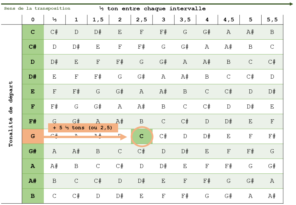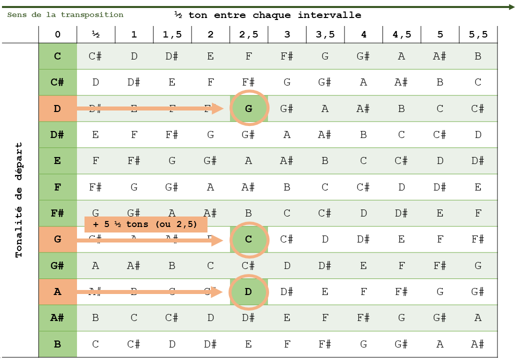 J’ai augmenté la tonalité de 2,5 tons (ou 5 demi-tons) de tous mes accords (Cf Grille de transposition juste en dessous)
