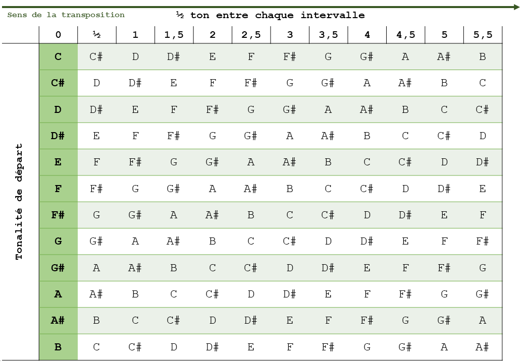 Voici une Grille de transposition qui permet de connaitre facilement toutes les modifications d’accords qui vont être réalisé.